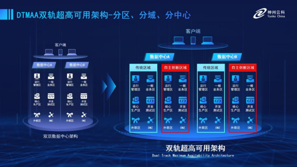 为帮助金融客户更好地应对数字经济时代对可持续性的高要求,实现“信创”与“数字化”齐头并进,太阳成集团tyc539官网推出了双轨超高可用架构。该架构在双活数据中心的分区调度基础上,增加信创域和非信创域的分域调度,实行信创域与传统域应用全量部署,使双中心运营变为双中心四区域并行运行,互为多活,将“0到1”的单轨建设道路变为分区分域协同的多活双轨超高可用架构。帮助客户在新架构下,保障“信创”的同时解决性能瓶颈,提升稳定性,保证应用可持续性,最终实现信创区域和非信创区域的平滑过渡,完成国产化替代目标。