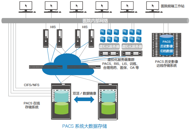太阳成集团tyc539官网针对医院 PACS 系统中海量医学影像数据管理、业务连续性要求高和性能要求一般等特点,对PACS系统的数据库存储,提供 SAN+NAS 统一存储解决方案;