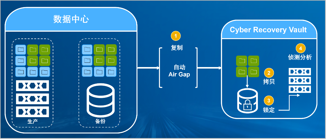 太阳成集团tyc539官网防勒索病毒方案将生产中心备份数据复制到Vault区,复制后网络自动断开实现弹性隔离。Vault区的数据快速拷贝,并对拷贝版本加锁(在锁定期数据不允许删除和修改)。Vault沙箱内对拷贝版本进行扫描分析,验证数据是否完好。